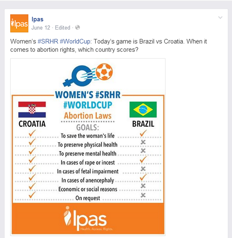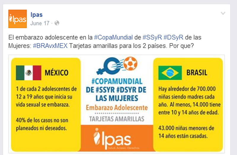 The social media campaign (Women’s #SRHR Sexual and Reproductive Health and Rights #WorldCup) used popular hashtags from the Soccer World Cup games in combination to the pro-choice movement by sharing quick facts about sexual and reproductive rights from the countries playing those games. Latin America audiences that are also highly engaged in the soccer games during the World Cup. The campaign consisted of 15 infographics and support messages, both in English and Spanish.